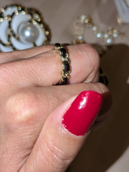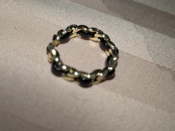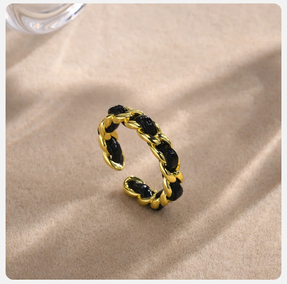 Elevate your handwear with the Echo Woven Chain Ring. Featuring a striking gold and black interwoven design, this piece offers a unique tactile experience and a sophisticated contrast that bridges the gap between classic gold and edgy modern style.